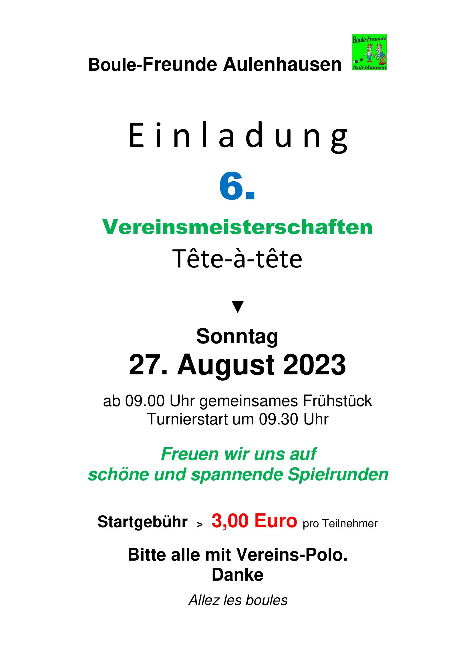 | August 2023 | 4 / 11 / 18 / 25 | 6 / 13 / 20 / 27 | 6. Vereinsmeisterschaften Tête-à-tête 27.8.23 |